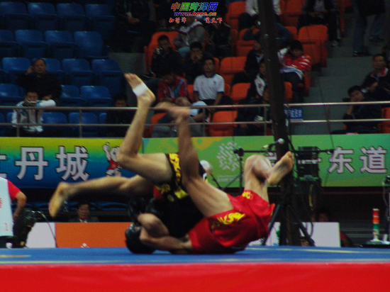 在15日上午举行的男子67.5kg级胜进4强的比赛中,山东队选手张勇(右)用抱单腿拉腿摔将对手宁夏队姜春鹏摔倒在台上,赢得了全场观众的喝彩。该场比赛,张勇战胜姜春鹏,顺利晋级4强。