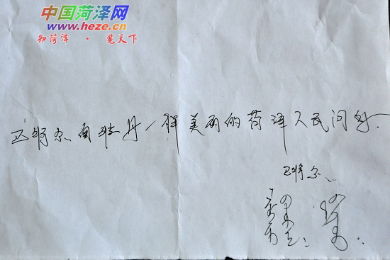十一运武术散打比赛77.5公斤级决赛结束后,中国菏泽网记者对该级别金牌得主陕西队的敖特根巴特尔进行了采访,巴特尔表示通过中国菏泽网他了解了很多关于菏泽的信息,并盛赞了菏泽的组织工作,特别对菏泽人民的热情及许多风味美食赞不绝口。虽然他只会蒙古文字不会书写汉字,但应记者邀请还是欣然为广大网民题词:巴特尔向牡丹一样美丽的菏泽人民问好。