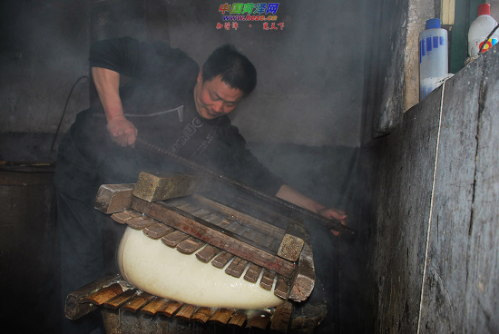 昨日,记者来到他们家时,吕爱英正将黄豆倒入榨汁机磨碎取汁,满满的两大盆浸泡好的黄豆格外引人注目。榨汁机隆隆作响,饱满的黄豆粒伴着清水转眼变成了浆液。在厨房的另一边,李长光正在给地锅加火。吕爱英将磨好的豆浆滤去豆渣,倒进锅内煮开,不一会儿空中飘满了豆香味。半个多小时后,煮熟的豆汁被倒进大缸中。“点卤水需要技巧,点多了味道发苦,豆腐又硬又老,很不好吃,点少了又不易成个。”李长光告诉记者。他一手拿着茶壶向缸中点卤水,一手搅拌豆汁,不一会儿,豆浆开始凝结成块。15分钟后,白嫩的豆腐花呈现在大家面前。随后,夫妻俩将豆腐花全部舀入木匣子里,打包压制成型。10几分钟后,一个白白嫩嫩的豆腐就做成了。
