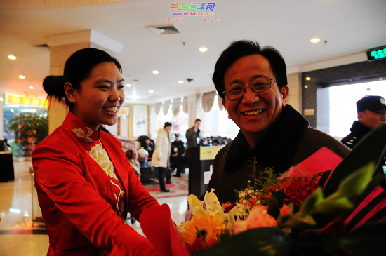 1月19日上午,菏泽花都大酒店员工向前来参加市政协十三届三次会议的政协委员献上鲜花。