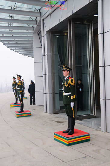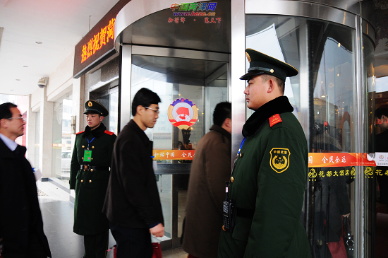 1月19日,武警战士在花都大酒店、菏泽大剧院等会议驻地值勤。
