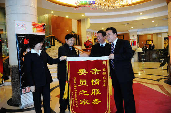 1月21日下午,市政协工作人员在秘书长卞维平、原秘书长胡卫东的带领下,将一面写有“亲情服务 委员之家”的锦旗送至花都大酒店,对政协会议期间该酒店的热情、周到服务表示感谢。
