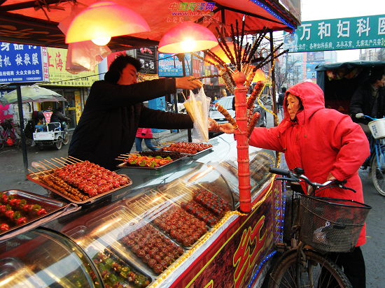 中国菏泽网消息 “都说冰糖葫芦儿酸,酸里面它裹着甜。都说冰糖葫芦儿甜,可甜里面它透着酸。糖葫芦好看它竹签儿穿,象征幸福和团圆。把幸福和团圆连成串,没有愁来没有烦……”入冬以来,在菏泽东方红大街上,挂着“老北京”招牌的冰糖葫芦摊仿佛一夜之间就布满了街头。红红的山楂按个头排列在竹签上,外面裹着晶莹剔透的糖衣,在阳光的照射下,发出诱人的光泽。