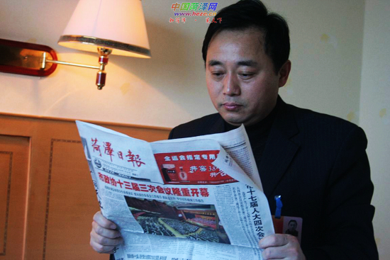 1月21日上午,单县代表团的人大代表付道春在宾馆内,抓紧时间阅读当天《菏泽日报》有关“两会”的报道,希望通过报纸全面及时了解两会动态。