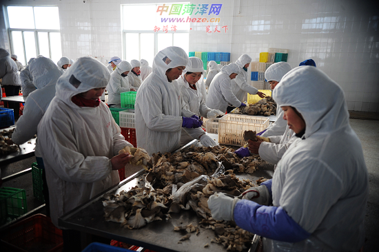 菏泽利得尔食品有限公司员工正在生产蘑菇罐头。该公司是西班牙客商独资的大型食品生产企业,主要生产芦笋、食用菌、黄桃等30多种罐头食品,产品全部销往国外。公司在一、二期工程总投资1200万美元的基础上,又投资1.8亿元进行了三期扩建,新上的辣椒、甜玉米生产线已投入生产。