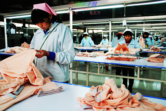 安博斯服装公司车间生产现场。由诸城锦源安博斯服装公司投资1.5亿元兴建的成武安博斯针织面料及服装生产项目,男装、女装、童装三大系列200多个花色品种全部出口。