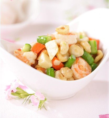 主料:夏威夷果仁100克、冬笋粒100克、芦笋粒100克、胡萝卜粒100克、鲜虾160克