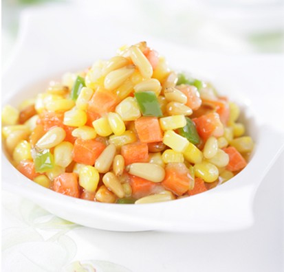 主料:松子仁50克、 玉米粒300克、胡萝卜半个、青椒适量