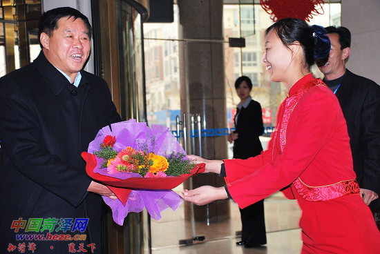 截至20日15时30分,出席市十七届人大五次会议的各县区代表团全部抵达菏泽。今年承担人代会接待工作的牡丹大酒店、南华大酒店、天宏大酒店等酒店都制定了周密细致的接待服务方案,让人大代表在会议期间有一个温馨舒适的工作生活环境。图为天宏大酒店服务人员向巨野代表团献花。