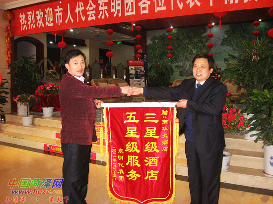 22日下午,出席市十七届人大五次会议的东明代表团工作人员向菏泽南华大酒店负责人赠送锦旗,以感谢该酒店提供的热情接待和真诚服务。