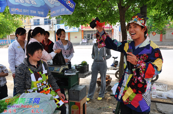 杨晓琼穿着乞丐服,打着竹板,到集市上每一家摊位前说唱莲花落讨钱,“这个葱,是好葱,一头白、一头青,一头实在一头空,给俺五毛中不中?”刚说唱了几句,就遭到对方一阵数落:“滚!年纪轻轻不学好,干啥不挣钱哪,学要饭!”