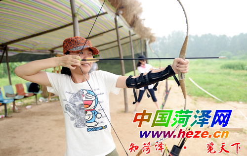 这边网友骏马奔驰,那边网友张弓拉箭。箭有长短不一,弓有轻重之别。在教练很用心的动作讲解下,网友开始纷纷尝试。最远的靶子放在30米外,实在打不到,于是8米远的四个靶子就遭到大家的围攻。通过亲身体验,大家才知道,原来射箭是不能用手去抓箭尾的,弓弦将力量传递到箭尾上,根本就抓不住,得用手指勾住弓弦才对。从拉不满弓到弓弓满弦,从不断跑靶到箭箭中的,女网友尽显飒爽英姿,男网友更露须眉本色,大家陶醉其间,各有收获。