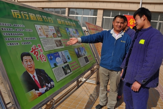 11月18日,几名职工在观看勤俭节约宣传牌板。连日来,山东丰源集团股份有限公司张集煤矿组织党员干部及职工群众认真学习十八届三中全会公报,通过发放学习材料、制作宣传牌板、举办专题辅导讲座(视频)等形式,组织好、传达学习好全会精神。