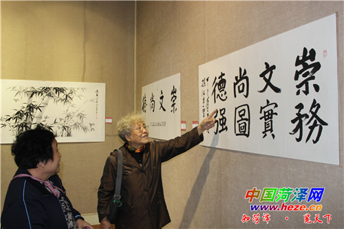 此次作品展共征集国画、书法篆刻、摄影作品共计400余幅,其中不乏李荣海、刘守安等名家之作,当天选择重点作品进行了展览,活动持续到本月17日,感兴趣的市民可以前往参观。图为两位老年艺术爱好者品评参展作品。