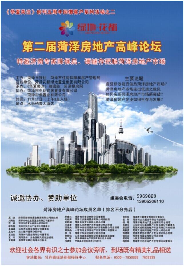 此次论坛围绕“房产新政下如何实现菏泽房地产市场新突破”“菏泽房地产企业如何生存与发展?”等主要议题,特邀济南专家陈保启、谭继存教授会同有关部门领导、菏泽众多地产金融界精英人士以及专家学者,为菏泽房地产市场把脉论剑,预判宏观经济形势与房地产市场发展趋势,剖析房地产行业生存之道,发展之路,对菏泽房地产业发展提供前瞻性、战略性、方向性的思考。欢迎社会各界有识之士参加会议旁听,到场即有精美礼品相送。实地报名:牡丹路绿地花都接待中心。 参会报名电话:0530-7658888 7659999 组委会电话13905306110