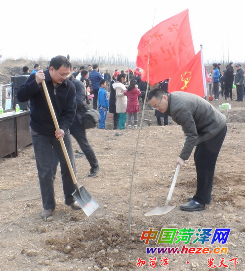 牡丹晚报总编潘若松(右)植下一棵新树苗
