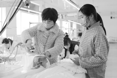 近日,在定陶区半堤镇万弘服饰品有限公司内,领班常贵华正在为刚上班的女工演示“小烫”。据了解,该企业自复工复产以来订单不断,有时需要加班来赶制订单。目前,已带动周边村、镇约180余名留守妇女实现就近就业。 记者 邢恩波 孙 涛 摄