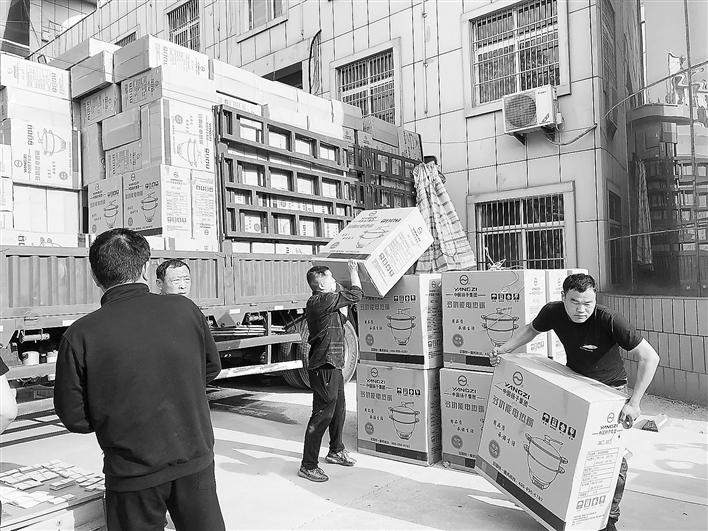 ◀为提升脱贫成效,凝聚扶贫攻坚力量,定陶区滨河街道办事处联系动员辖区鑫怡热力、维也纳、祥光新天地、天中容器等15家企业,共同筹资20余万元,为辖区内2162户建档立卡贫困户捐赠爱心物资。