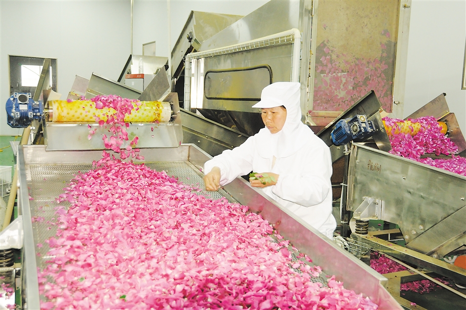 “我们镇整合扶贫资金570万元,引进全自动无菌化一条龙生产线,可收购种植玫瑰2000多户村民的玫瑰花,带动他们脱贫致富。”何庄村扶贫车间负责人邵长征说。