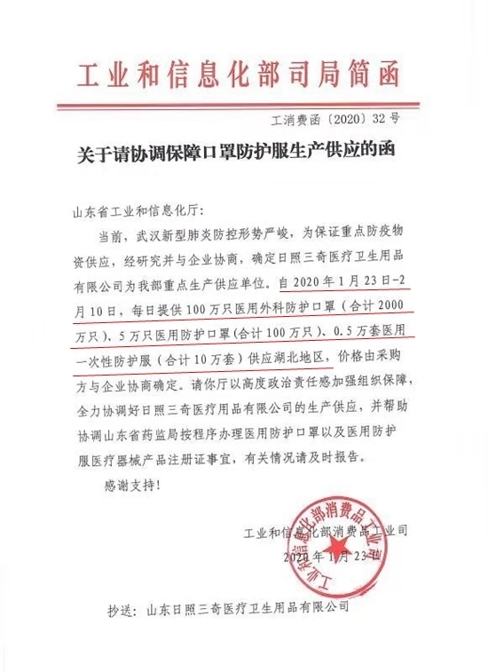 公司办公室桌上放着一份红头文件,它吹响了三奇医疗全力冲锋的号角。“自2020年1月23日至2月10日,每日提供100万只医用外科防护口罩,5万只医用防护口罩,0.5万套医用一次性防护服供应湖北地区。”