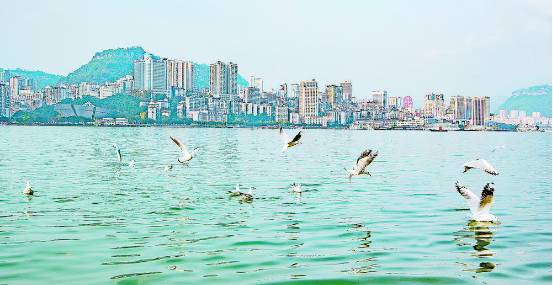 一汪平湖碧波荡漾,两岸青山绿荫葱葱。幢幢高楼拔地而起,街道巷陌车水马龙。