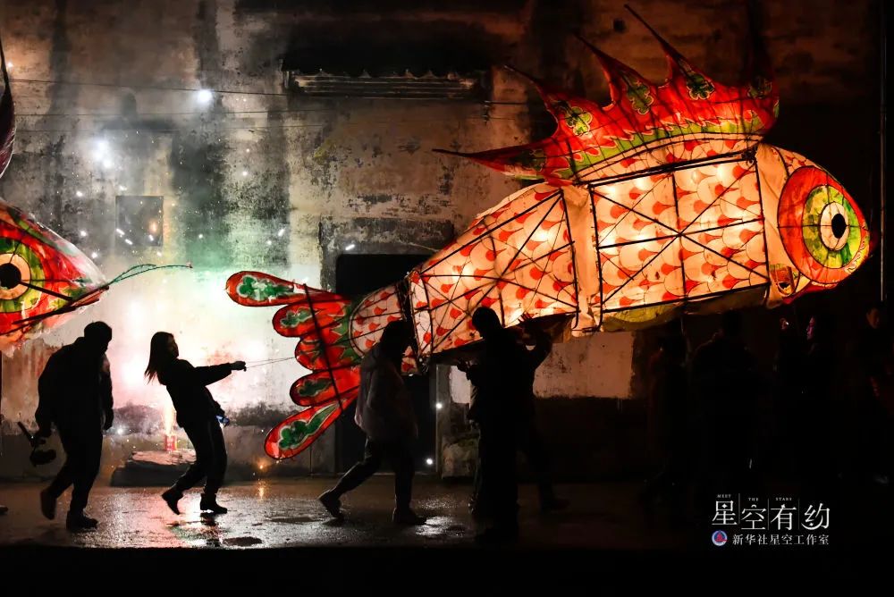 2021年2月26日是农历正月十五元宵节,在安徽省黄山市歙县溪头镇汪满田村,游客和村民嬉鱼灯,闹元宵。新华社记者韩旭 摄