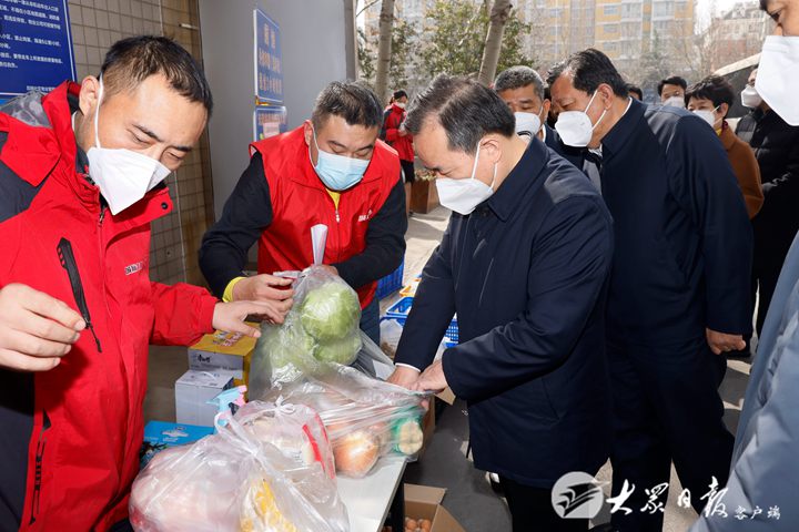 离华实小区不远的盛泉小区,因疫情防控需要目前实行封闭管理。社区居民生活是否有保障?李干杰对此十分关心。他来到小区封控入口处,察看新鲜配送的一批水果蔬菜。社区负责人介绍,小区封控后,粮油肉蛋奶果蔬等生活必需品由厂家直供,居民线上点单,厂家线下配货,再由社区有序分发给居民。李干杰说,封控、管控小区要把服务保障工作做得再细致周到一些,确保生活物资供应充足的同时,及时帮助解决群众日常生活遇到的就医用药等实际问题。