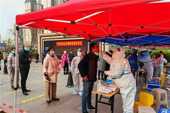 20日上午,记者在丹阳街道仝庄社区核酸采样点看到,检测现场划分了信息登记排队区、等候区、采样区等,待检人员保持前后一米间隔排队等候。身穿防护服的“大白”们正在紧张忙碌着,在志愿者的协调、引导下,检测现场秩序井然、运转高效。