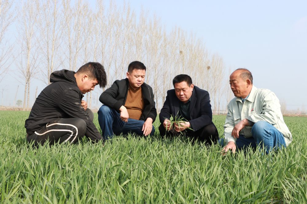 3月24日,山东汶上县苑庄镇道立种植农民专业合作社成员正在查看苗情。(受访者供图)
