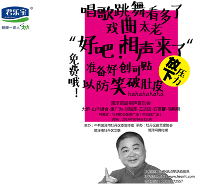 据介绍,本次巡演活动由中共菏泽市牡丹区委宣传部、牡丹区文联主办,市曲艺家协会协办、菏泽网腾传媒独家承办!届时主办方会为菏泽市民免费提供包括开闭式在内的十场巡演活动,并陆续走进马岭岗镇(穆李村)、黄镇、黄罡镇等10个社区巡回演出,本次巡演将通过相声、评书、幽默节目等群众喜闻乐见的表演形式,为观众奉献上一场高水准的消夏娱乐盛宴。