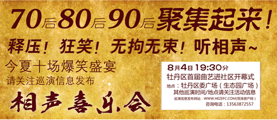 中国菏泽网消息 (通讯员 李保珠)牡丹区首届曲艺进社区系列巡演将于8月4日19:30在牡丹区委政府广场正式拉开帷幕啦!著名笑星山东卫视主持人大新;东方卫视《笑傲江湖》优秀选手,酷口相声开创者山羊组合;坠子皇后刘瑞莲等众多明星加盟此次巡演活动,他们将走进社区、广场、院坝,走到群众中间,召集60后70后80后90后共享爆笑盛宴!打造菏泽独一无二的欢乐消夏晚会。